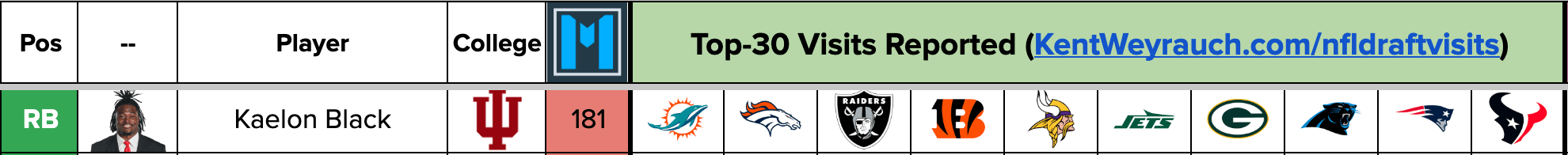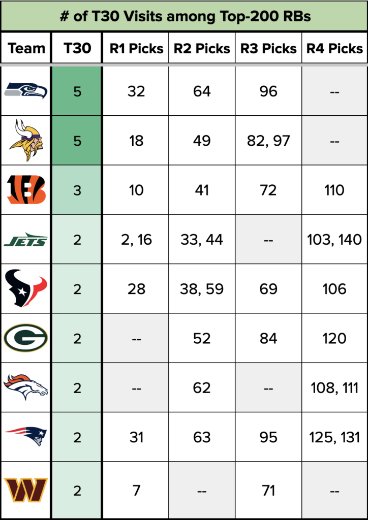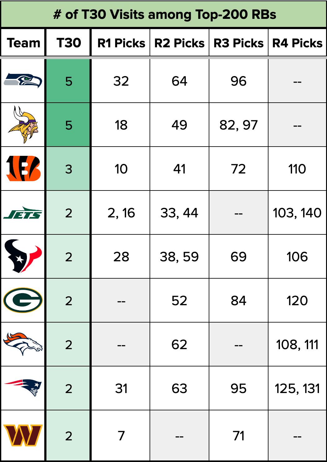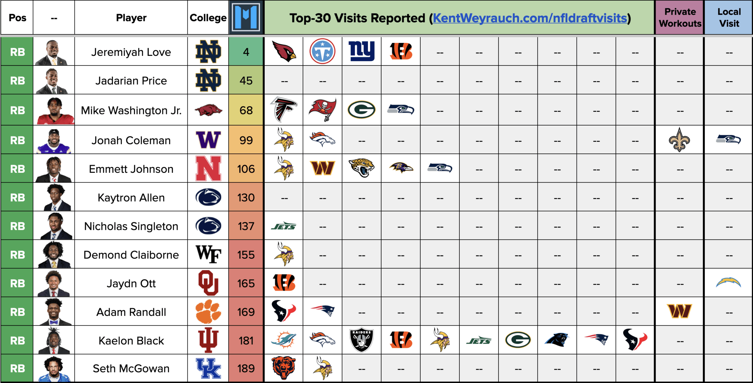 Repeating this again: the total number of visits for a prospect is NOT what we should focus on. The number used by teams on RBs is the signal.