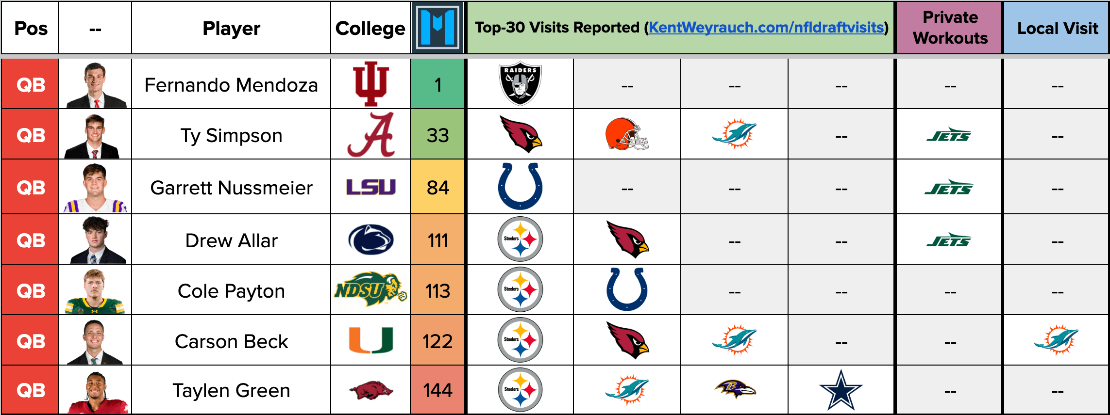 With Simpson seen as a fringe 1st/2nd round pick, you can easily connect him to one of those teams and their “later” 1st round picks. As many have pointed out, “playing chicken” at the QB position by finding “value” is simply not advisable. If you believe someone is a franchise QB, you are willing to take him early rather than gamble. A franchise QB is the rarest commodity in all of sports” is the thinking. But let me give you a few data points related to prospect visits to sit with for Simpson: