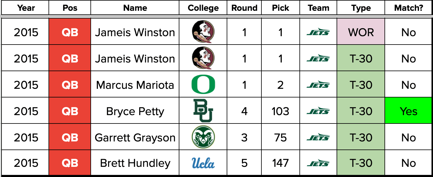 For example, the 2015 Jets (staying with the team) had 5(!) top-30 visits for QBs and a private workout with Jameis Winston. However, with the Buccaneers selecting him 1st overall, he was off the board. With Mariota also off the board by the time they were on the clock for Pick 6 (Leonard Williams), you can see they moved on to the “next tier” at the QB position. Keep in mind you can’t pick that QB if they aren’t on the board when you are drafting.