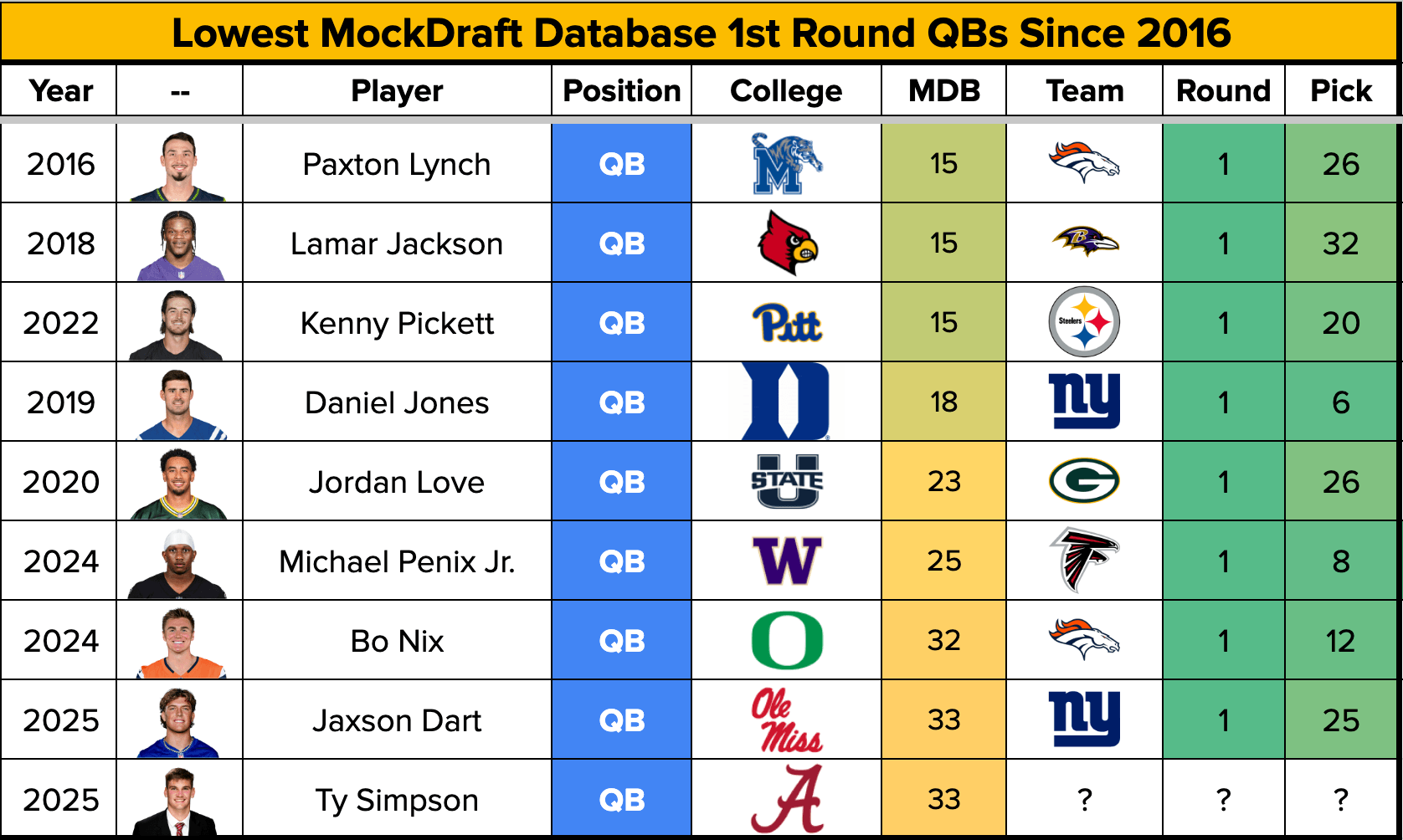 If he is a first round pick, Simpson would be tied for the lowest final MockDraft Database consensus rank (could change in the next week) over the last decade: