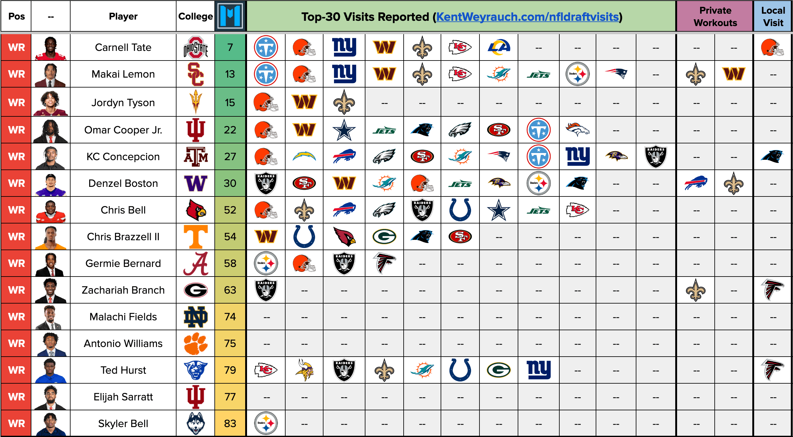 This is reflected in the number of reported prospect visits among the top-end prospects For accounting purposes, we have a bevy of players such Carnell Tate, Makai Lemon, KC Concepcion, Denzel Boston and Omar Cooper Jr. lead the pack with 7+ visits for each. There have been reports that we could see six WRs taken in the 1st round including all six before pick 24, something that has occurred just once over the last decade.