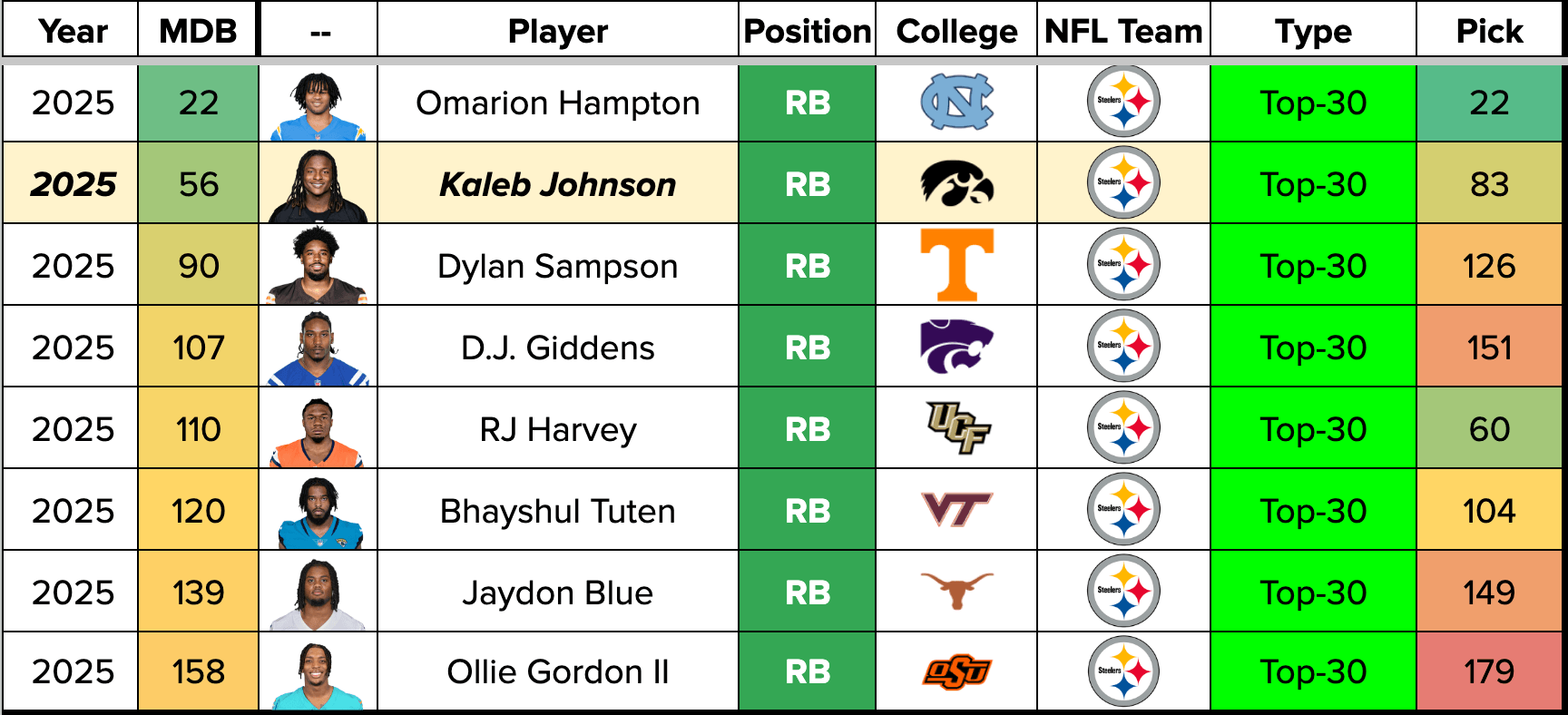 Now this also did not mean these were the only RBs on the menu for the Steelers to choose from. It was just hard connecting the dots based on what we haven’t seen. I wrote last year “based on history, the Steelers have an 80+ percent chance of taking a RB within the first four rounds despite only have three picks.”
