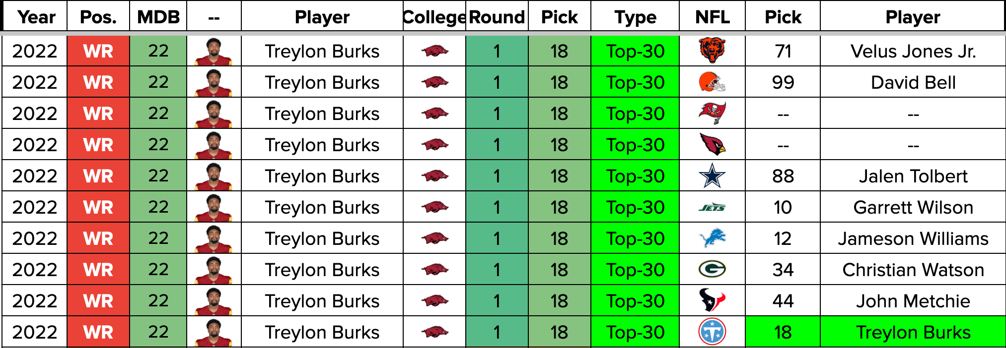 Take for instance Treylon Burks (hold your laughter until after the article folks). He finished 22nd overall on MDDB and was drafted 18th overall by the Titans. However, 10(!) different teams brought him in for top-30 visits.