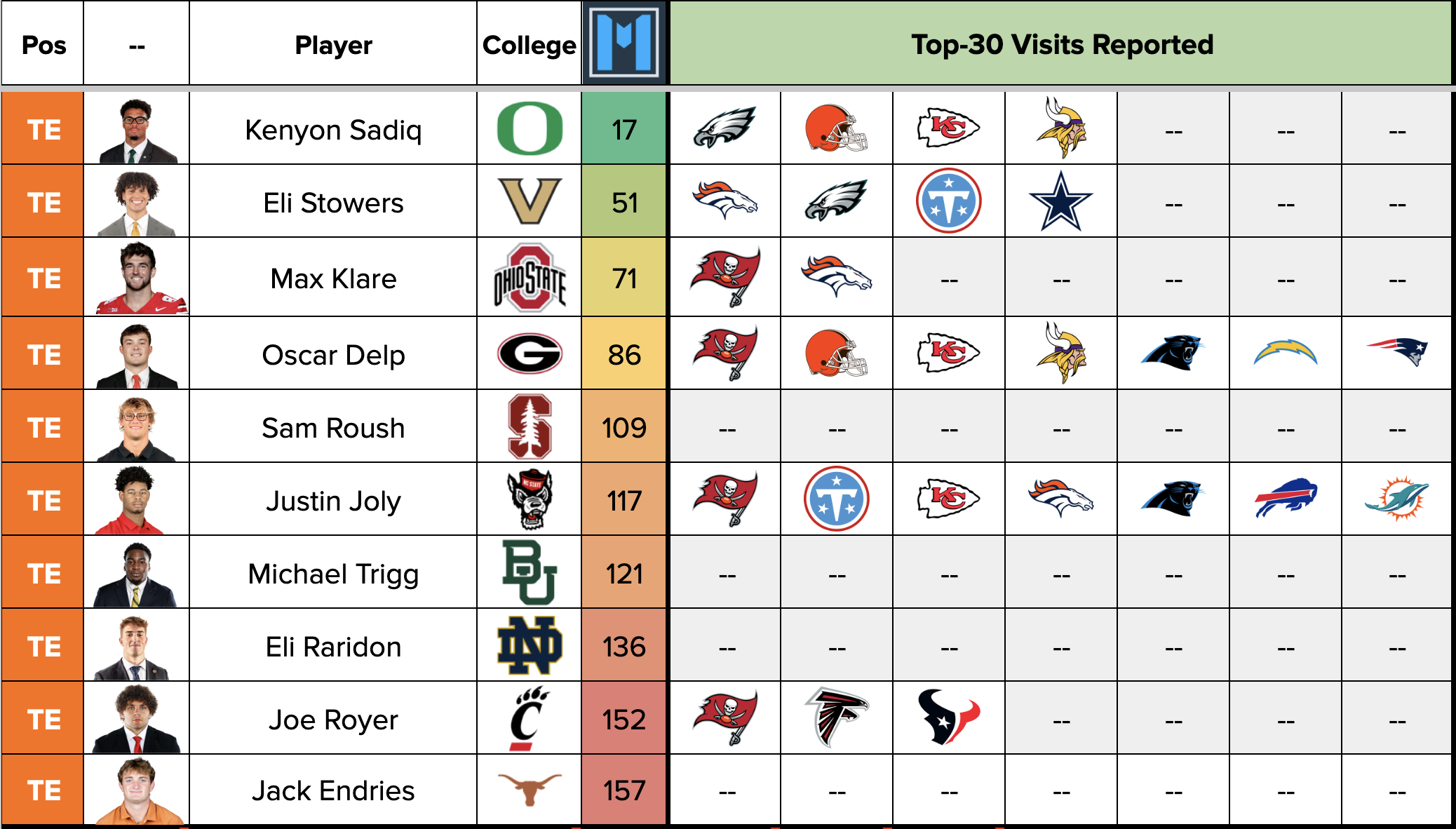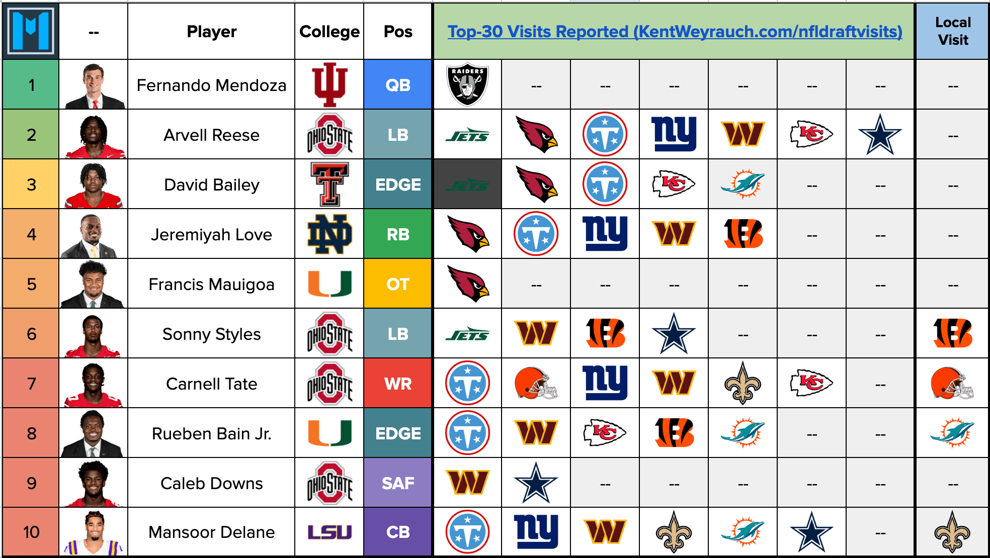 For 2026, here are the top-10 prospects (based on MDDB) and the visits reported.