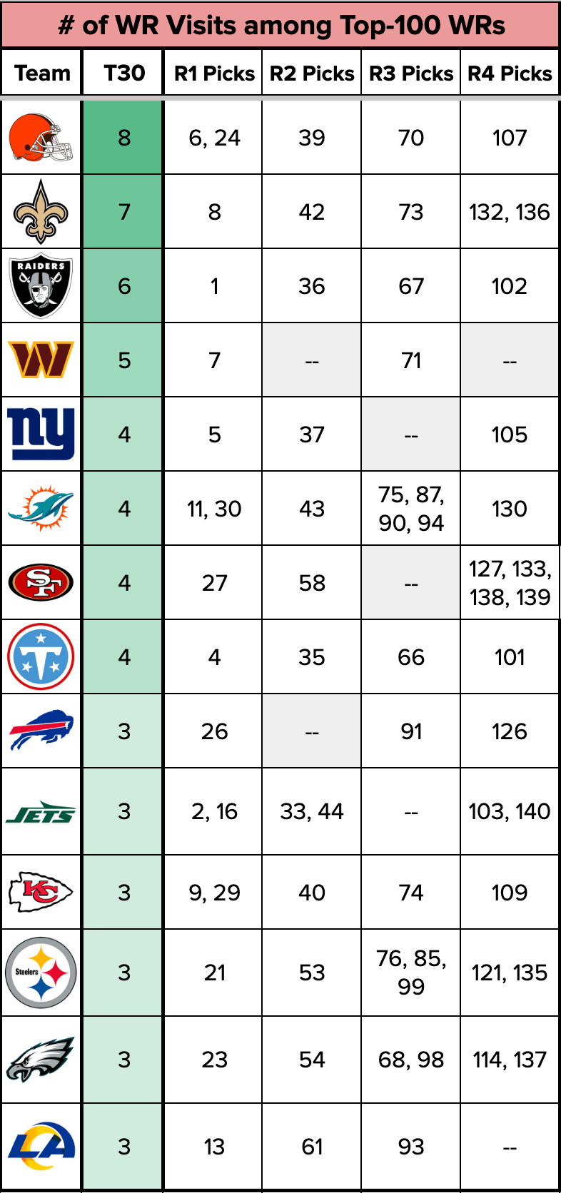 Looking back over the last decade, here are the teams with 7+ visits and the WR they selected: