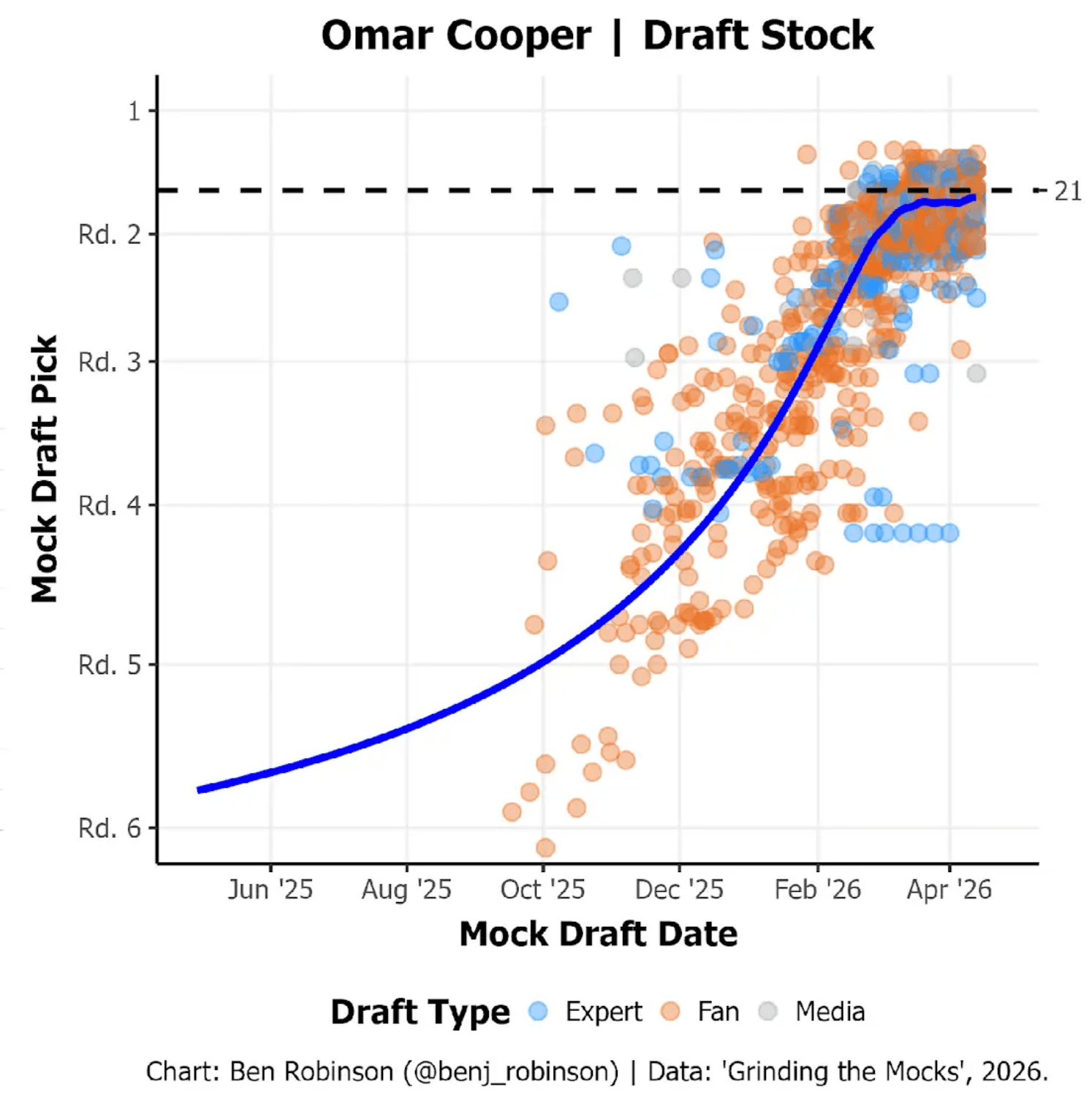 Omar Cooper Jr.– Cooper’s rise up draft boards (as detailed below from GrindingtheMocks) needs to be put in perspective. It feels quite similar to the narrative spun around Matthew Golden last year. Let me be clear: these are very different players in terms of play style and NFL adaptability. Emeka Egbuka was similar to this last year with his final MDDB number sitting at 31.