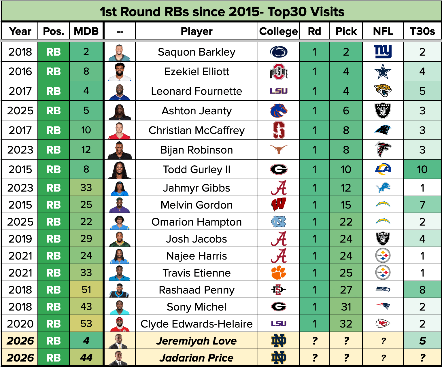 How did we come to that figure? Over the last decade, if a team uses 3 or more top-30 visits on a RB, they’ve selected a RB in the 1st 4 rounds 80.6% of the time.