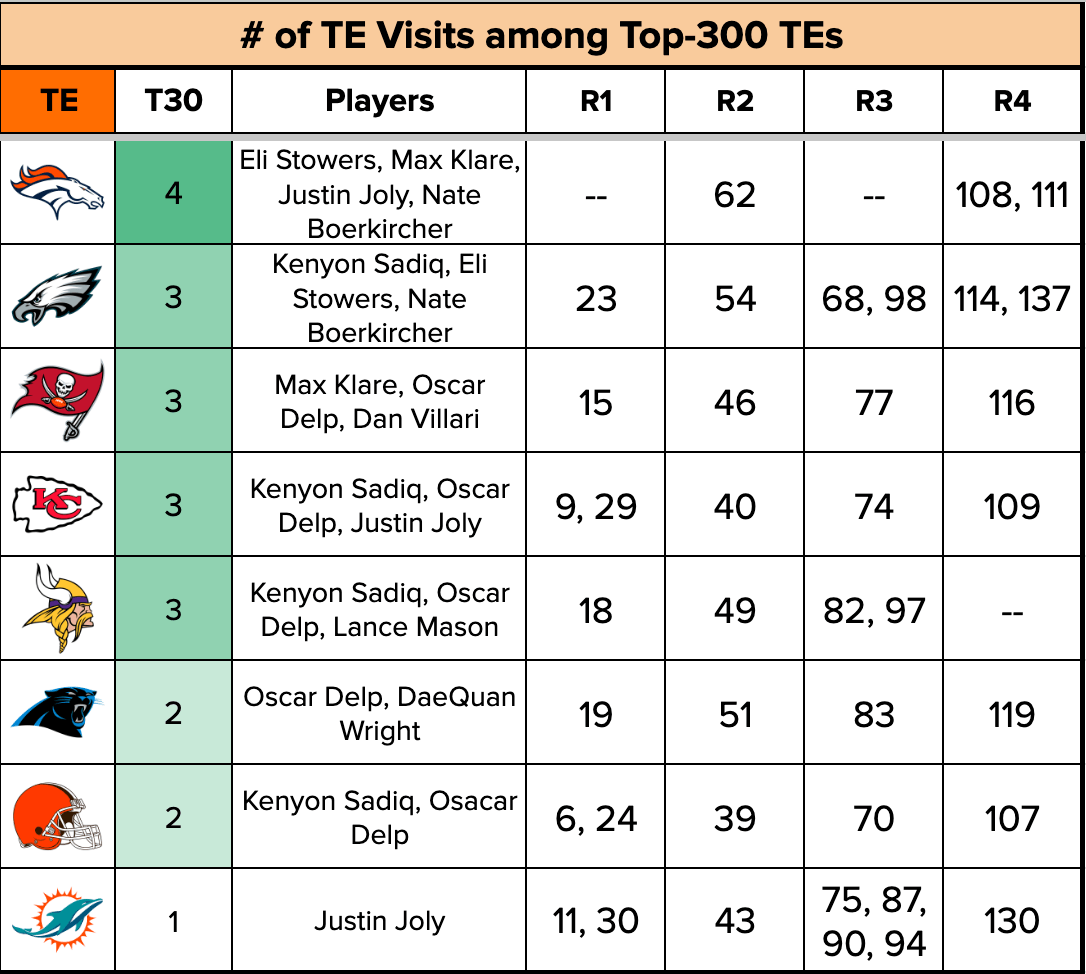 The intention of NFL teams and mock drafters is quite clear: we know a 1st round TE when we see one. Since 2015, we’ve had 31 TEs taken in Rounds 1 and 2 of the draft. 22 of those teams (71%) that selected a TE had at least ONE top-30 visit or workout.